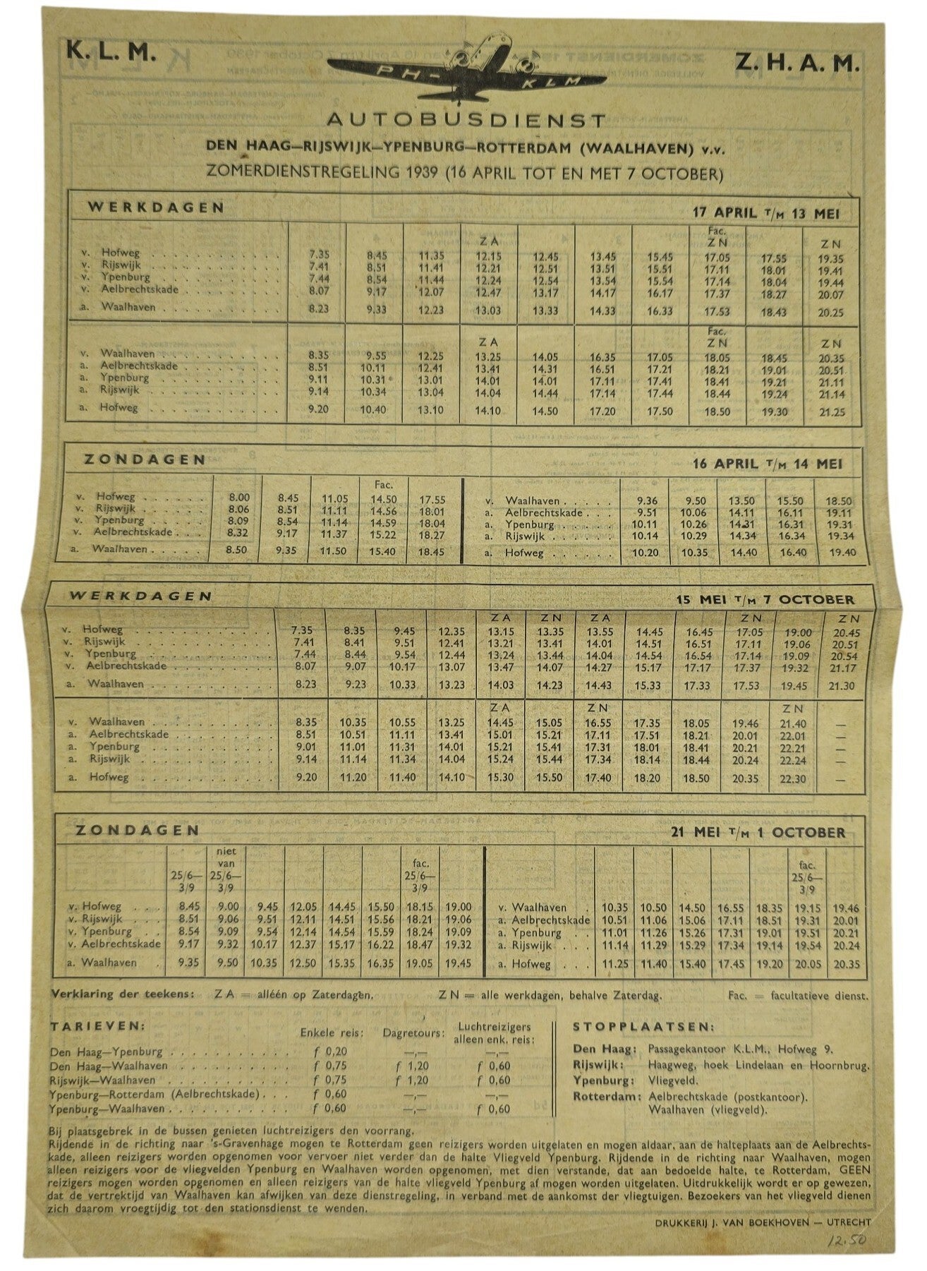 Document – KLM Autobusdienst zomerdienstregeling Den Haag–Rotterdam (1939)