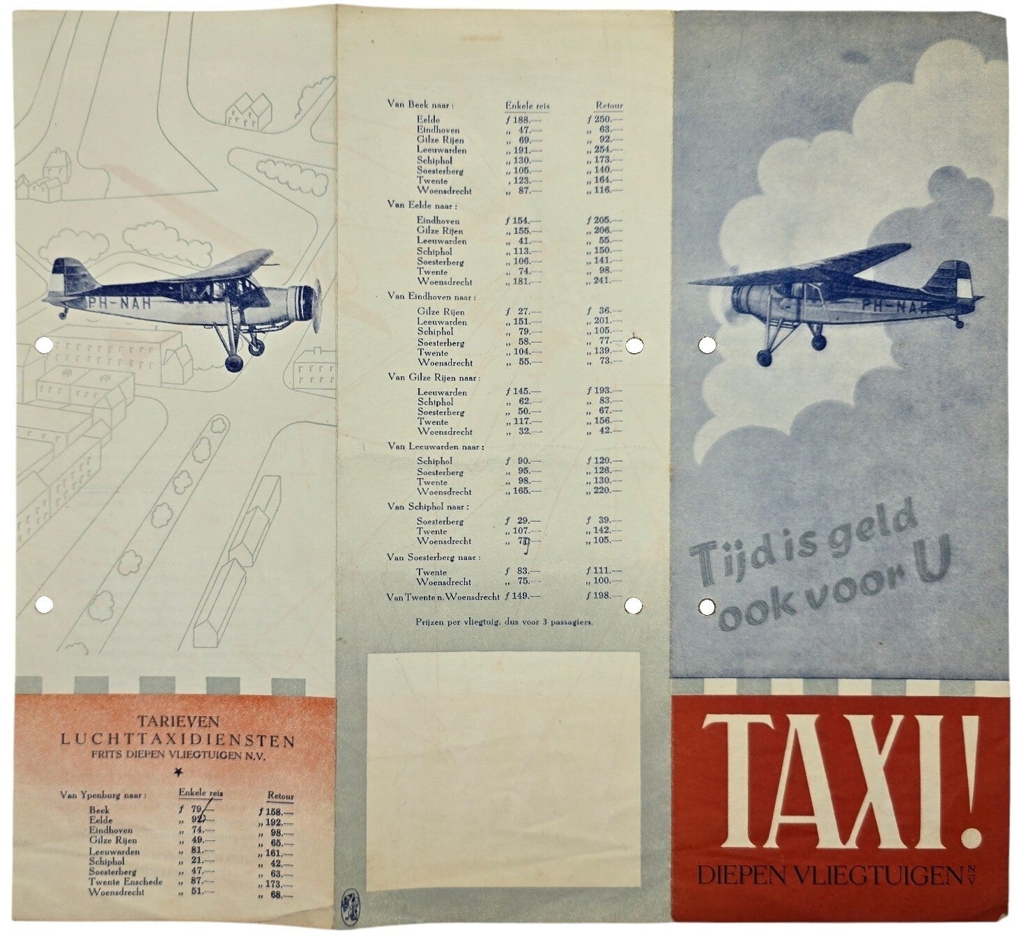 Gedrukte flyer met tarieven voor luchttaxidiensten per vliegtuig. Het document toont prijstabellen voor enkele reizen en retourvluchten tussen Nederlandse vliegvelden, aangevuld met illustraties van lichte vliegtuigen en bedrijfsnaamgeving.