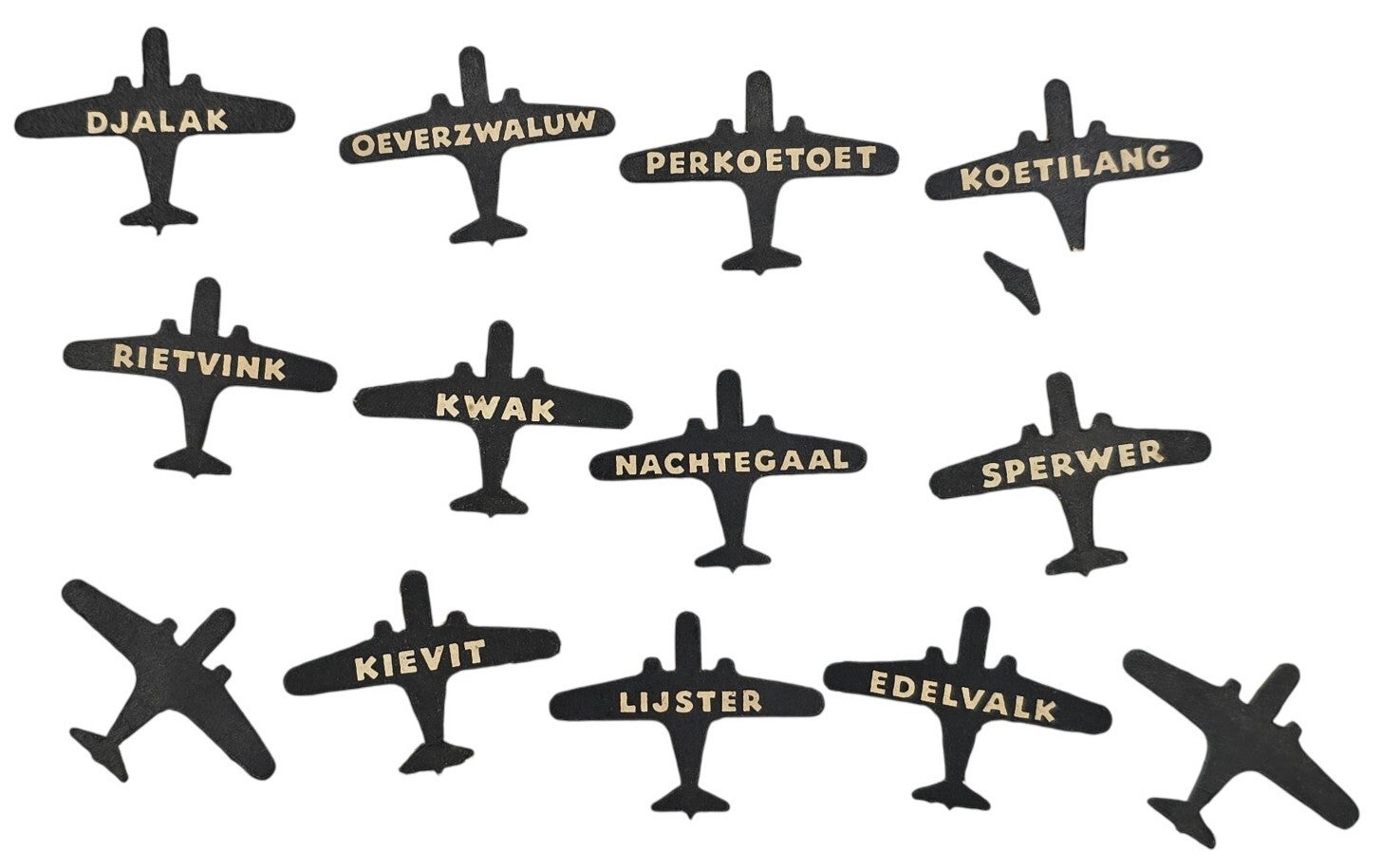 Document met afgebeelde silhouetten van vliegtuigen, elk voorzien van een naam die verwijst naar een vogel. De figuren tonen verschillende typen vliegtuigen in gestileerde vorm en lijken bedoeld voor herkenning of illustratief gebruik. Mogelijk om aan te geven waar de vliegtuigen zich op dat moment bevonden.