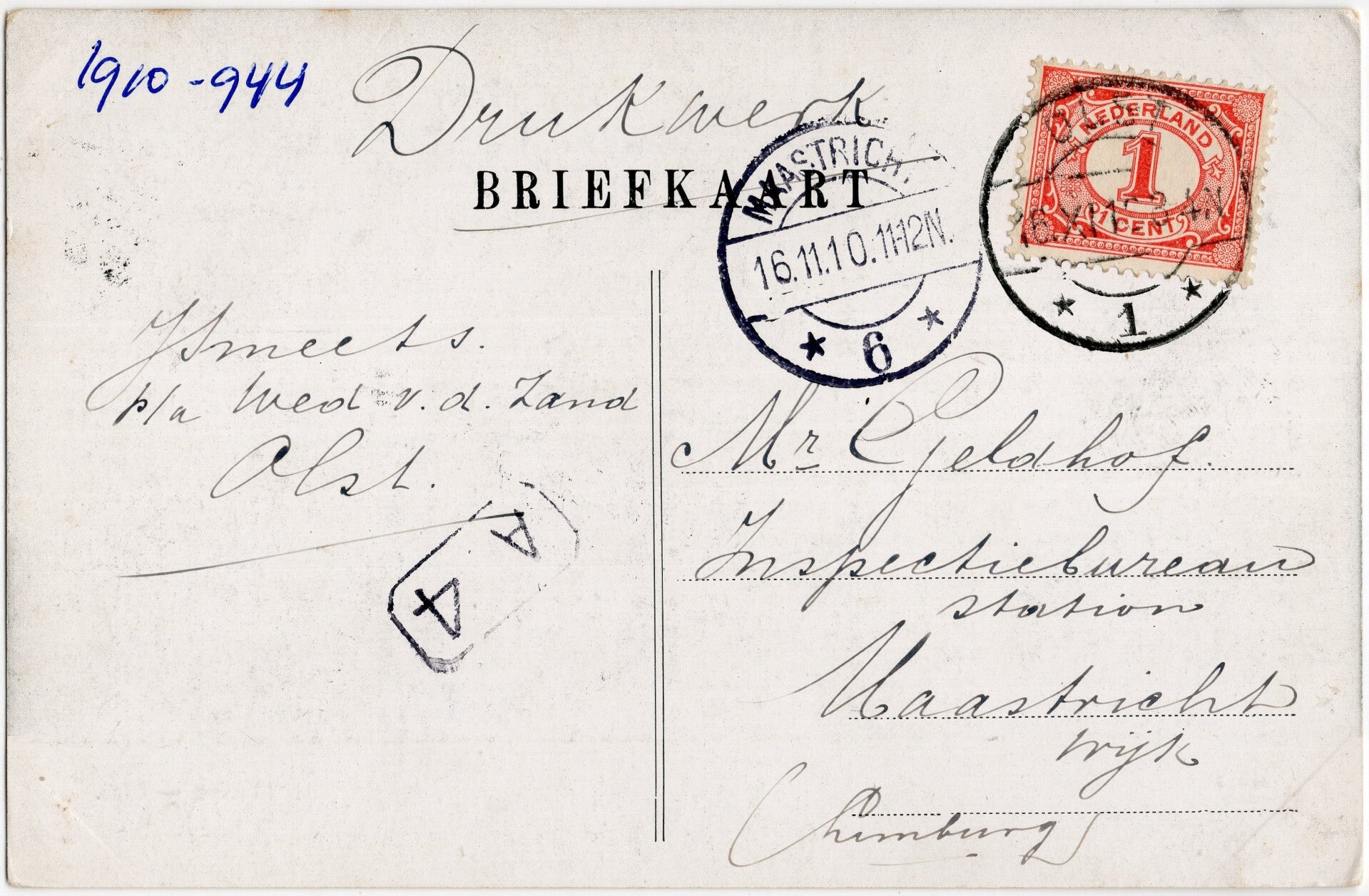 Verzonden naar: Mr. G. Jeldhof, inspectiebureau station, Maastricht, Wijck, Limburg