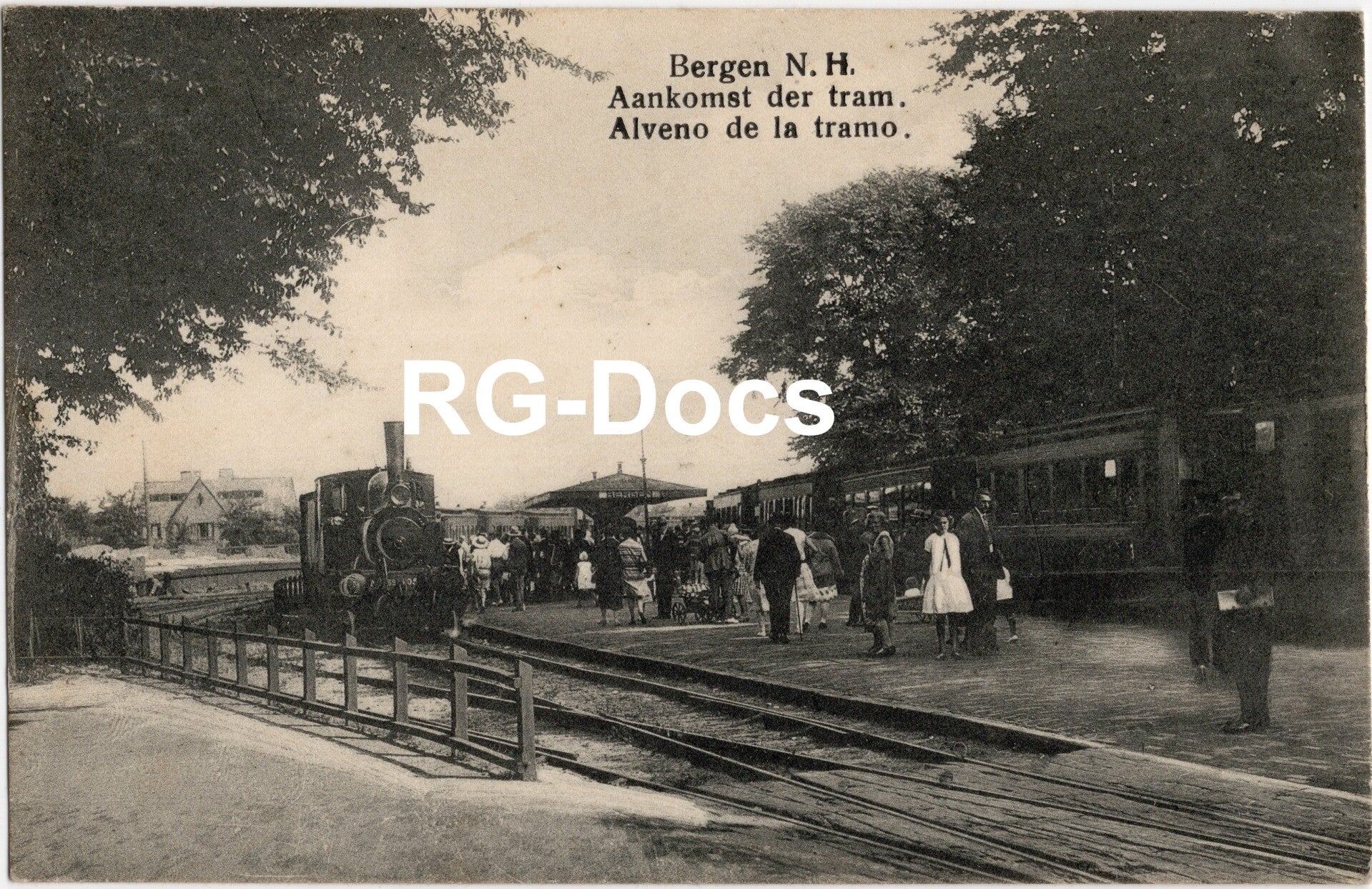 Ansichtkaart - Briefkaart Aankomst der tram Bergen N.H. - ca. 1937. Zwart-wit ansichtkaart van de aankomst van de tram in Bergen (Noord-Holland), met mensen op het perron en een stoomtram op de rails. Uitgegeven door L. H. Grootegoed.