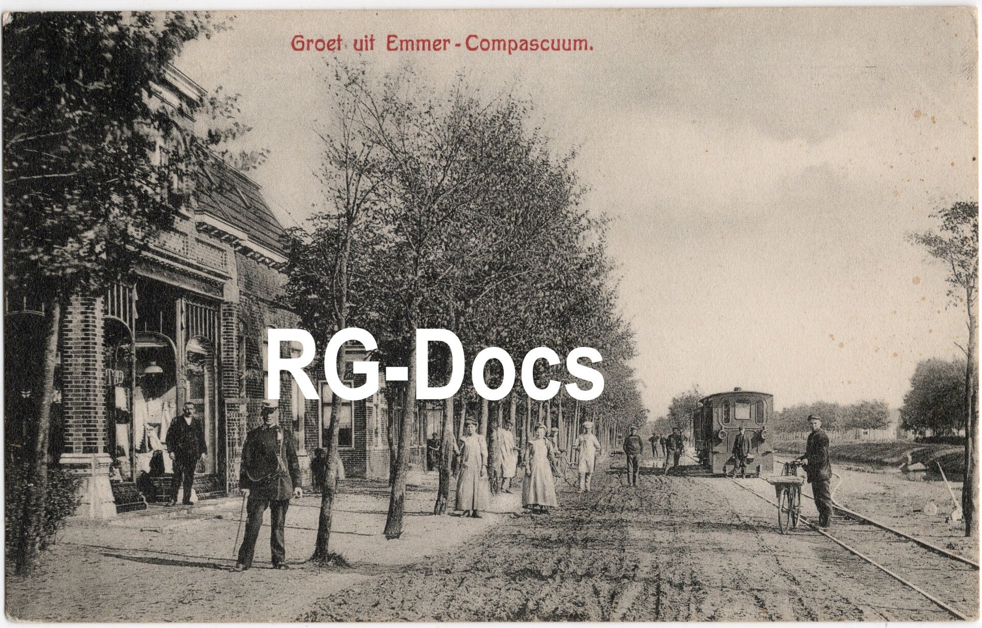Ansichtkaart - Briefkaart Dorpsgezicht Emmer-Compascuum, Met tram en passanten, Drenthe (1912)