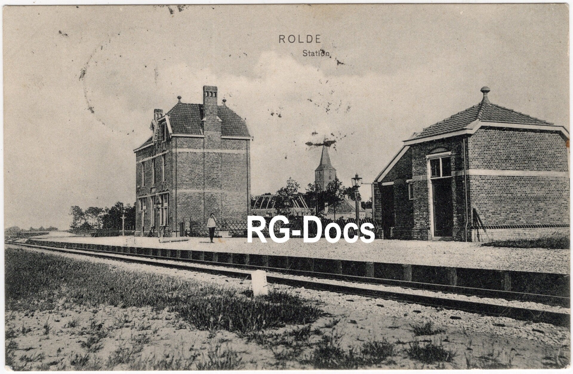 Ansichtkaart - Briefkaart Station Rolde - Stationsgebouw en Spoorlijn 1907. Zwart-wit briefkaart van het station van Rolde met het stationsgebouw, een bijgebouw en de spoorlijn. Op het perron staat één persoon. Op de achtergrond is de kerktoren van Rolde zichtbaar. De kaart is uitgegeven door G. F. Hummelen uit Assen en verzonden in 1907 van Rolde naar Assen. Het station Rolde was onderdeel van de NOLS spoorlijn Assen-Stadskanaal. Met kerk in het midden.