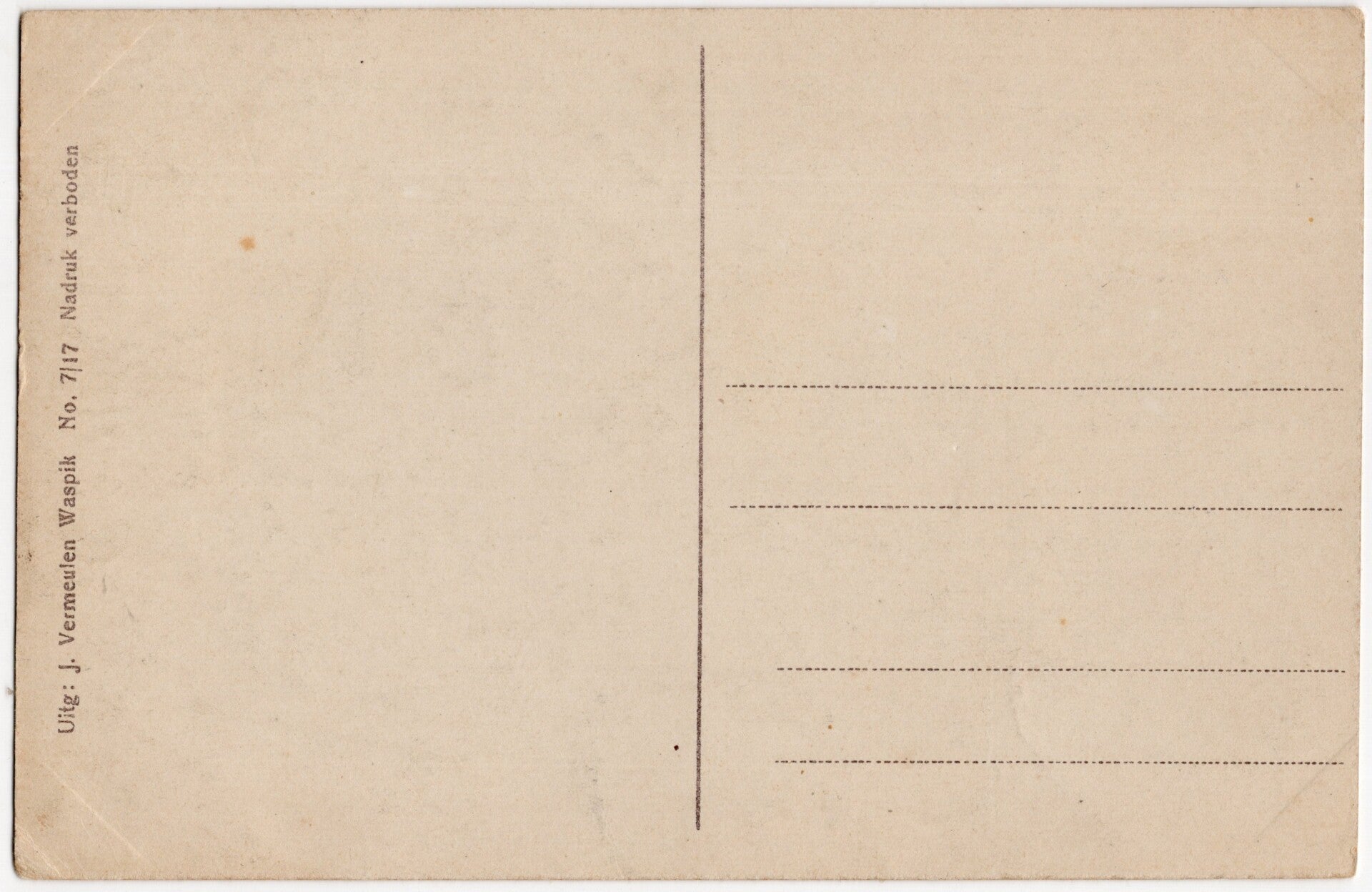Ansichtkaart - Briefkaart Station Waspik - Gezicht op het stationsgebouw ca. 1915. Zwart-wit afbeelding van het stationsgebouw van Waspik met de tekst 'WASPIK Station' op de gevel. Op de voorgrond is een persoon te zien. Aan de linkerkant van het gebouw staat een rij bomen. De kaart is uitgegeven door J. Vermeulen Waspik.